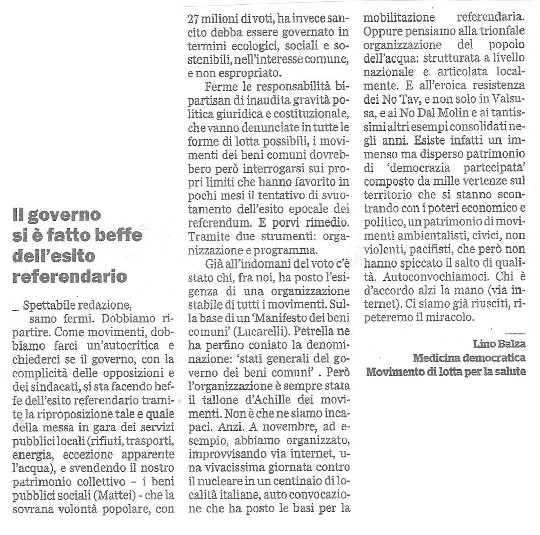 L’affermazione a giugno dei referendum ha avvertito finalmente giunto il momento di costruire una organizzazione nazionale stabile dei Movimenti, sapendo che nessun partito è in grado di rappresentarne le istanze. Di qui, la proposta di impegnarci per un” MANIFESTO DEI BENI COMUNI” e perciò di convocare gli “STATI GENERALI DEL GOVERNO DEI BENI COMUNI”, e infine, in piena autonomia, di costruire una “ALLEANZA PER I BENI COMUNI” cercando di coalizzare in un patto forze sociali, sindacali e politiche, centri sociali, circoli culturali, associazioni civiche, studentesche, reti, imprese sociali ecc. Dunque la proposta è di autoconvocazione dei Movimenti italiani: "Autoconvochiamoci! Abbiamo i programmi alternativi e gli uomini e le donne, ci manca l’organizzazione. Con l’organizzazione poniamo le basi per la creazione dal basso di una nuova classe dirigente che faccia fuori l’insopportabile occupazione del potere a tutti i livelli amministrativi e statali".